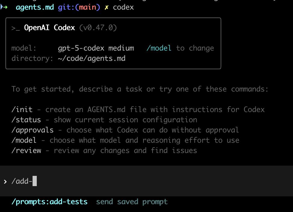 ~/.codex/prompts/add-tests.mdcontaining:Generate unit tests for the touched files. Use the project’s existing test runner and conventions. Keep diffs minimal and runnable locally.