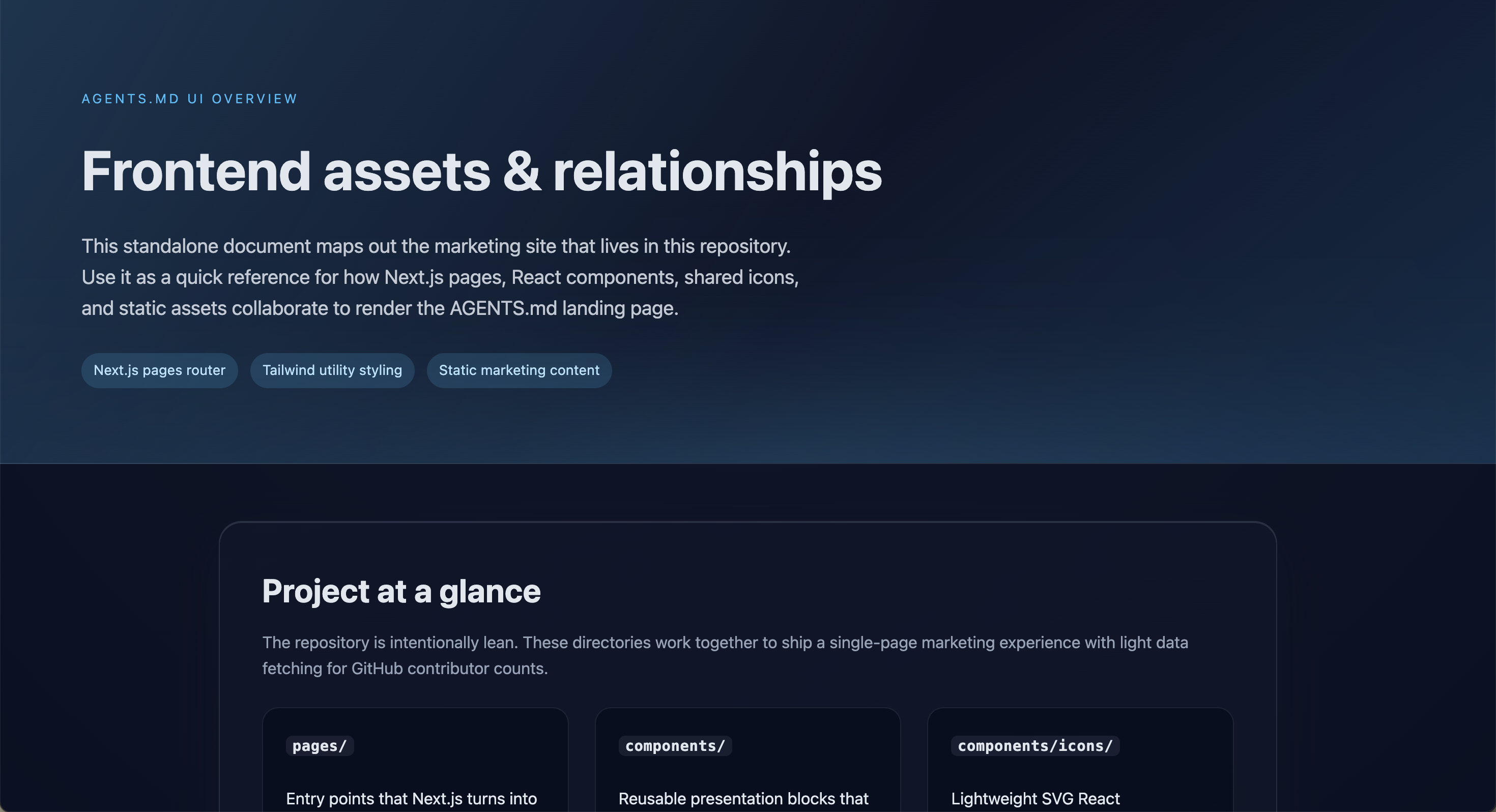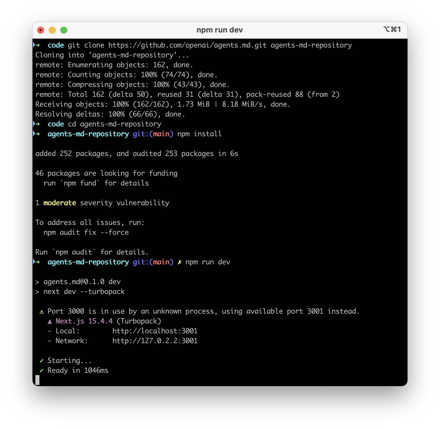 git clone https://github.com/openai/agents.md.git agents-md-repository(or download the ZIP from https://github.com/openai/agents.md and rename the folder toagents-md-repository). - Open a separate terminal for the dev server and launch it: