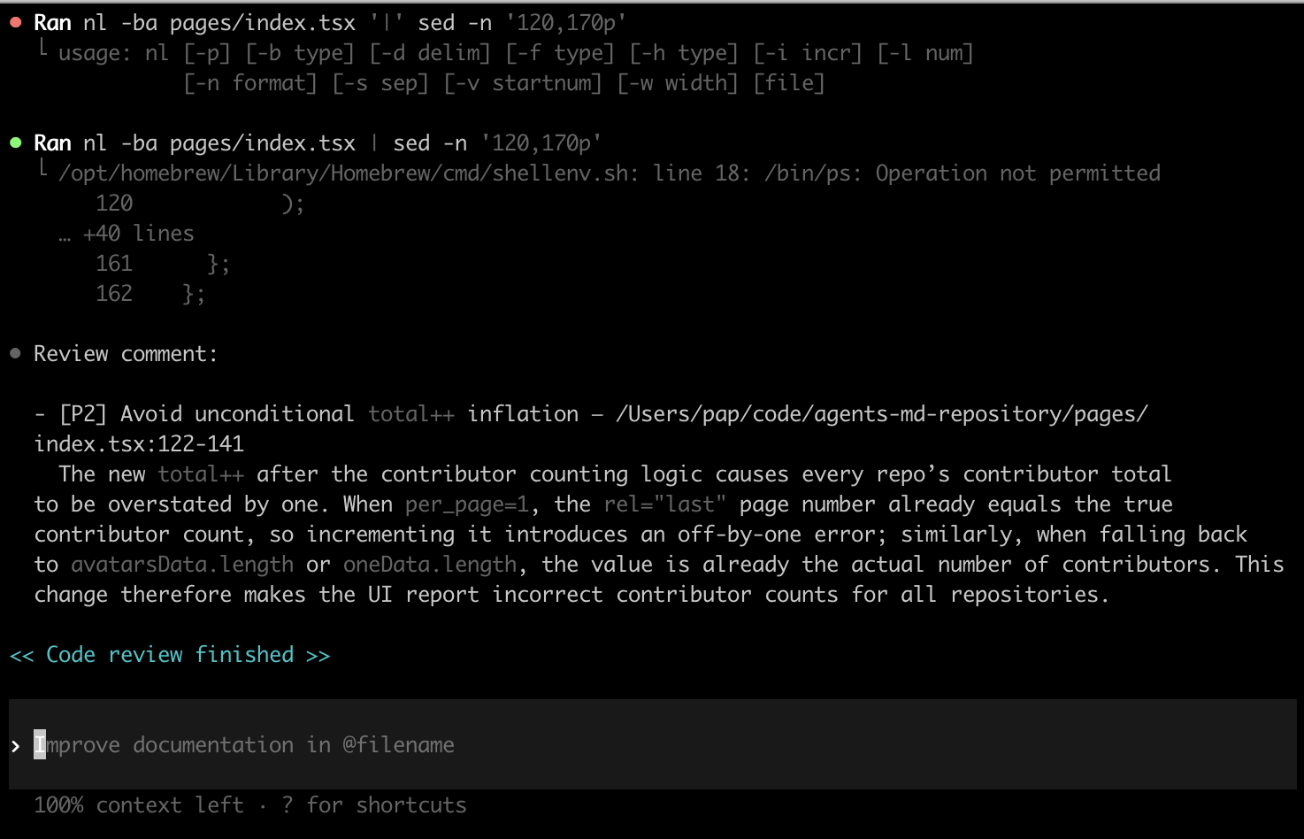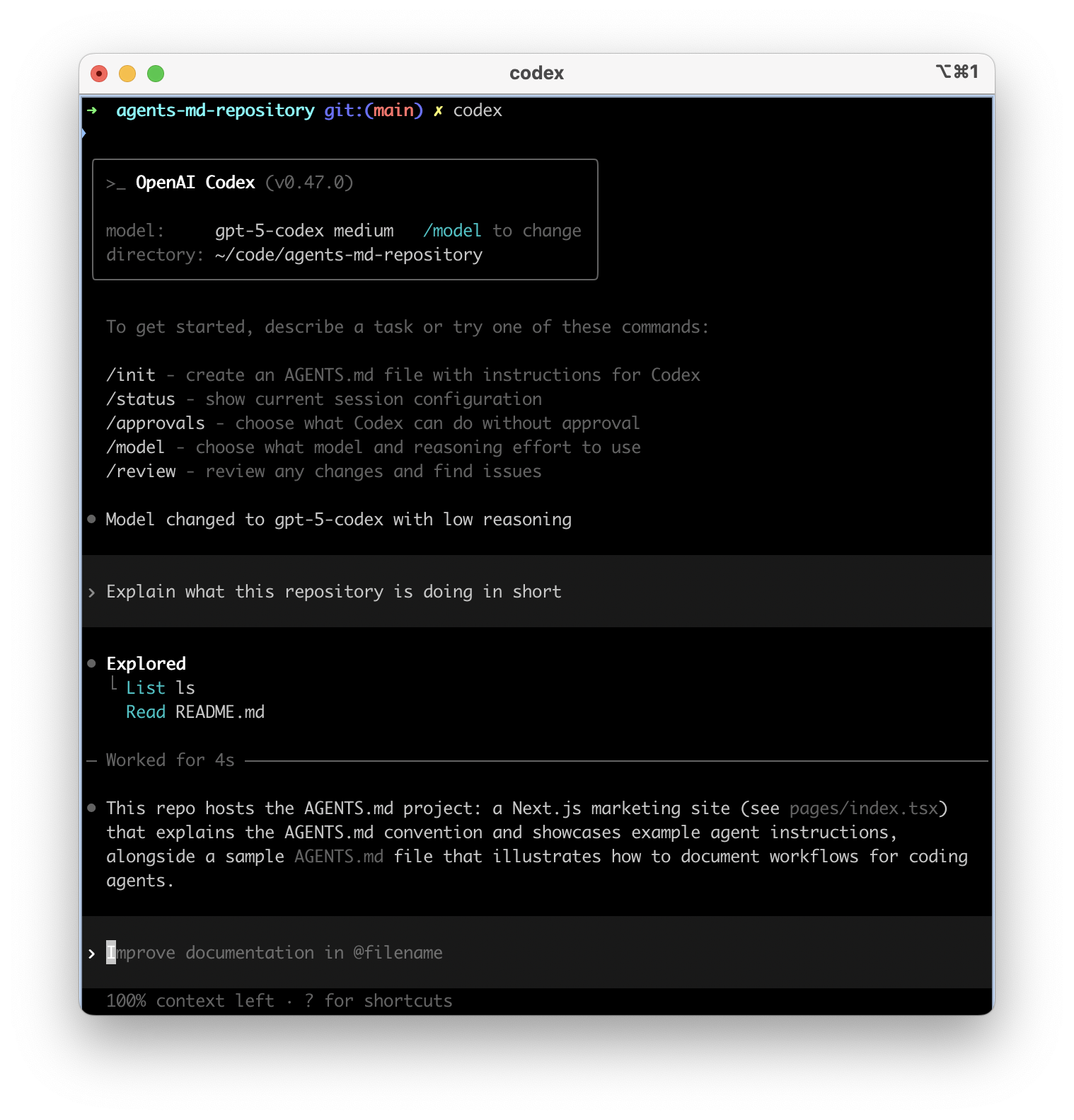 cd agents-md-repository npm install npm run dev - Leave that terminal running; you'll use a different shell window for Codex commands.