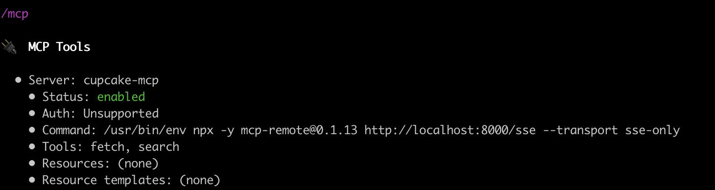 You should see thecodex mcp list codex mcp get cupcake-mcpcupcakemcpentry in both commands. - Spot-check the list output for the expected entry.