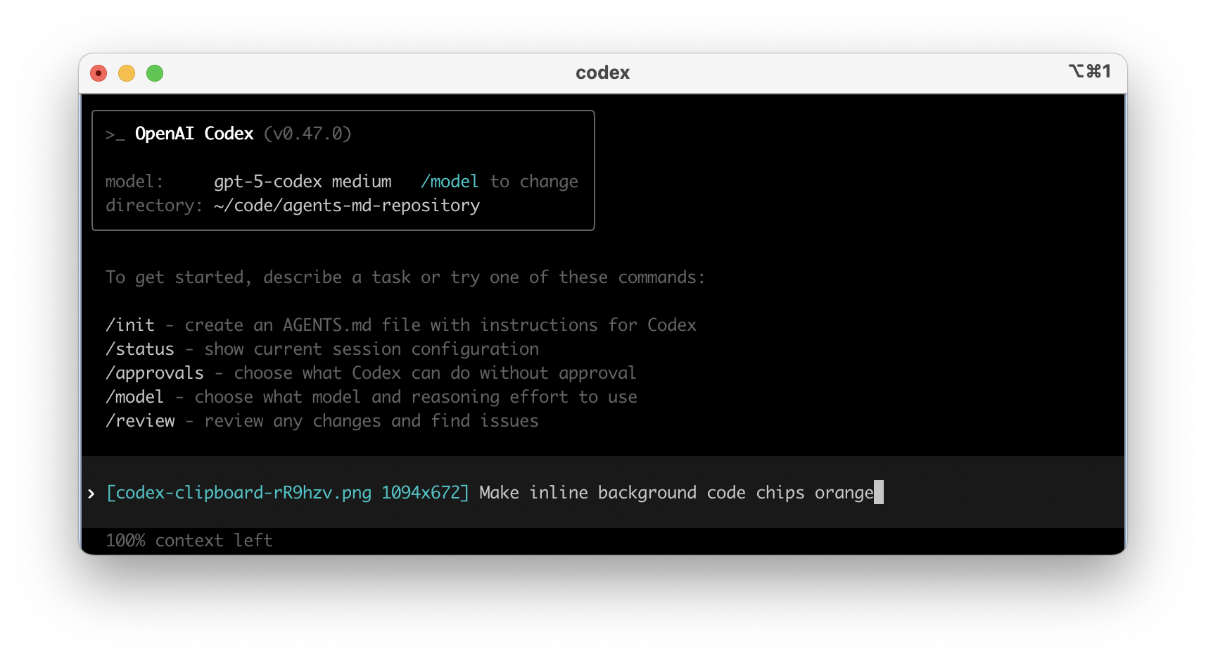@agents-textarea.png, then add:Make inline background code chips orange. - Verify Codex updates the UI styling based on the screenshot.