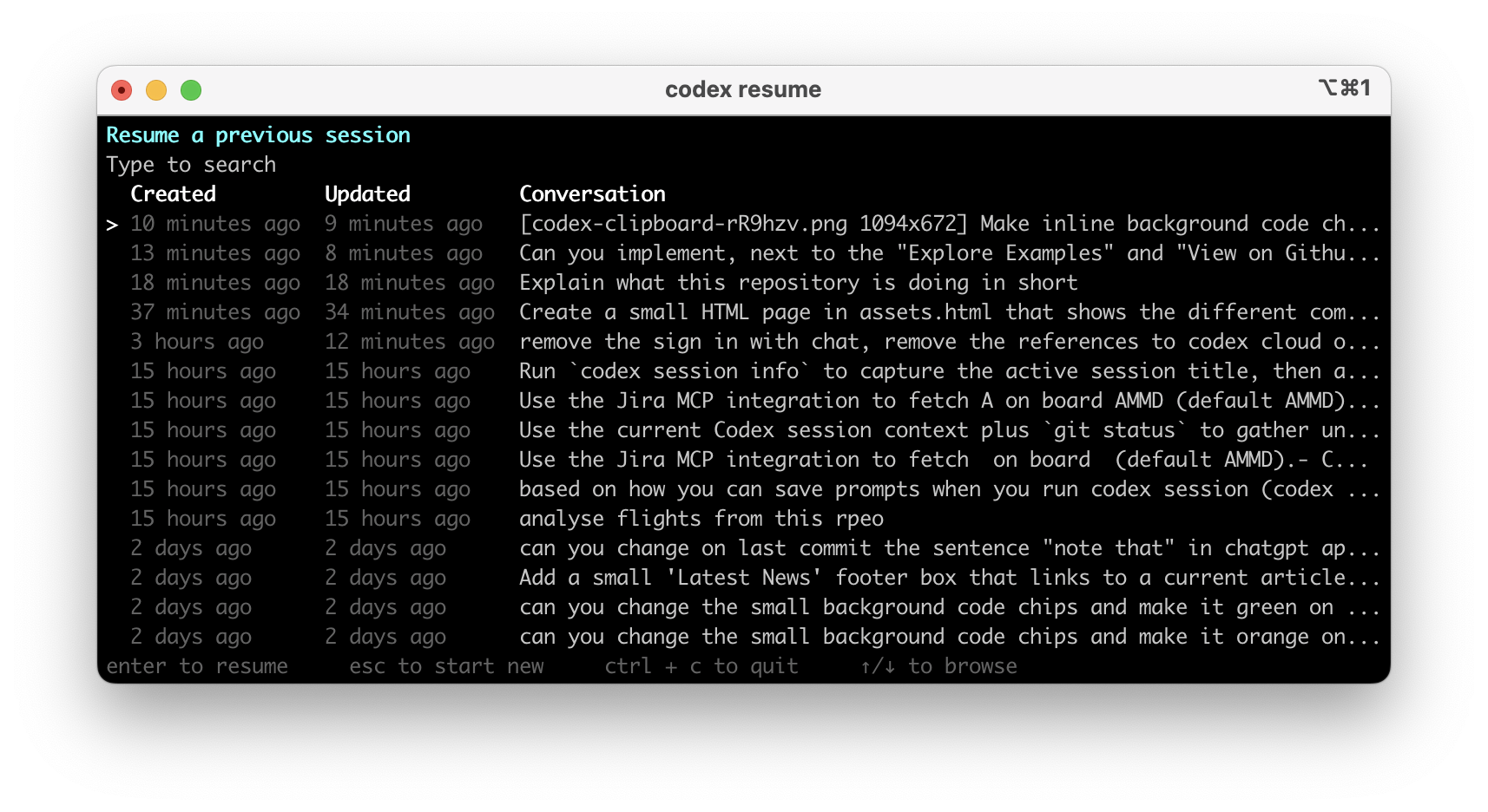 codex resume <session_id>directly at the end of a session, as shown when you exit the CLI.