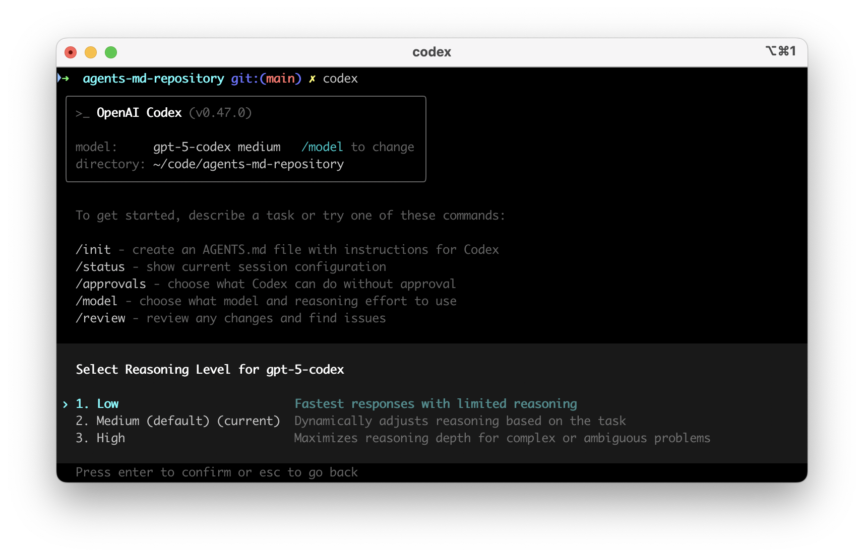 /model, and pick gpt-5.1-codex-max, then confirm Medium reasoning—best blend of depth and quality. - Keep this as the default before moving on so follow-up tasks use the best model.