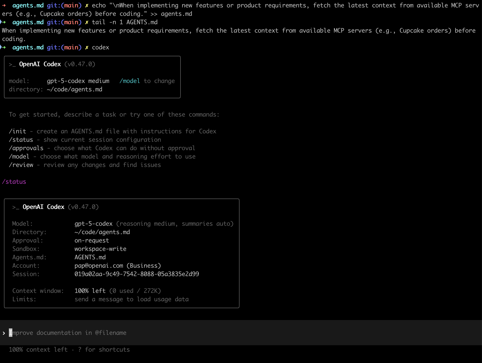 echo "When implementing new features or product requirements, fetch the latest context from available MCP servers (e.g. Cupcake orders) before coding." >> agents.md - Save the changes.